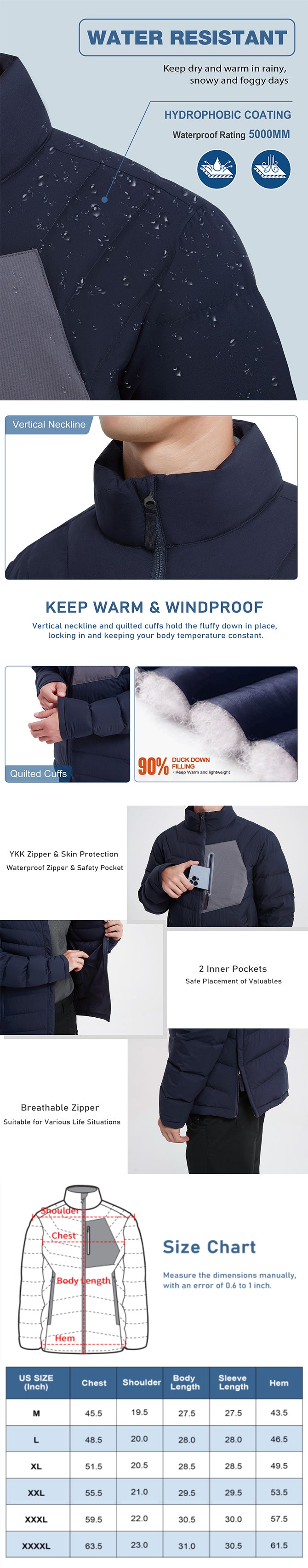 【5 Pockets Design】The men's puffer jacket has a water-resistant splicing pocket on the left chest, which can be effectively water resistant and suitable for storing valuables; Two large side pockets with water-resistant nylon reverse zippers; According to the shape of the side pocket, two inner pockets are combined internally that is pleasing to the eye and provide sufficient storage space.